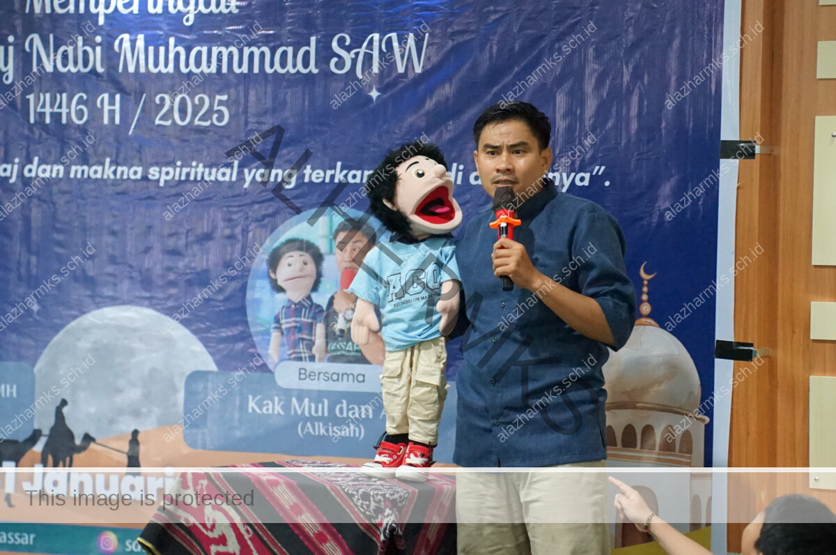 Sebagai bagian dari penyampaian materi yang menarik bagi anak-anak, acara ini menghadirkan Kak Mul bersama Aco, boneka yang menjadi ikon pendampingnya, dalam segmen Alkisah. Dengan gaya bercerita yang interaktif dan menghibur, Kak Mul berhasil membawa siswa menyelami kisah perjalanan Isra Mi’raj Rasulullah SAW dengan cara yang menyenangkan dan mudah dipahami.